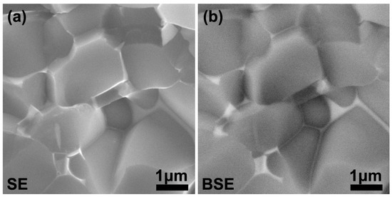 High-magnification secondary electron (SE) and backscattered electron (BSE) SEM images of the fracture surface of TiB2-5 wt. % CoCrFeNiAl ceramics sintered at 1650 °C are shown in Figure 5. The good wettability between TiB2 and HEA can be certified by the morphology. The bright phase is situated between grain boundaries, and its shape depends on the profile of the adjacent TiB2 grains. This phase can be preliminarily identified as HEA, because the HEA alloy melts into liquid phases at high temperatures. Liquid phase with excellent fluidity can enhance the densification of ceramics.