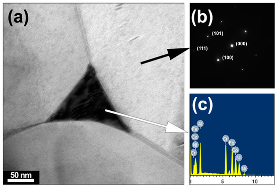 (a) TEM images of a bright place selected from the TiB2-5 wt. % HEA composites sintered at 1650 °C; (b) corresponding SAED of grain phase; (c) corresponding EDS patterns of liquid phase.
