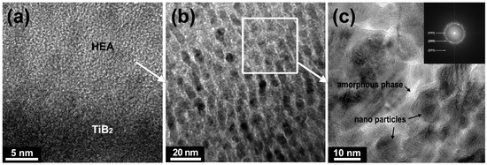 According to the TEM images of the boundary between ceramic and liquid phase in Figure 7a, the lower part is TiB2, as can be recognized from the complete lattice fringe, whereas the upper part is HEA. The inconspicuous grain boundary between HEA and the ceramics reveals a tight boundary structure, which is favorable to excellent mechanical properties.