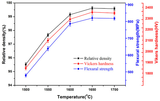 Figure 8 shows some physical and mechanical properties of TiB2-5 wt. % HEA ceramics obtained at different sintering temperatures. It is obvious that all the properties increase with the temperature going up from 1500 °C to 1650 °C. The peak values appear at 1650 °C with a relative density of 99.62 ± 0.12%, a flexural strength of 820 ± 9 MPa and a Vickers hardness of 2386 ± 18 HV5. However, when the temperature continues to rise, a slight decreasing trend can be observed in the line chart. The increase in densities and the enhancement of bond strength between TiB2 and HEA will raise the hardness and strength of the composites. The grain growth caused by high temperatures prevents the further improvement of the mechanical properties.