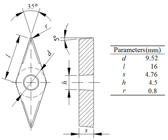 For turning operations, two types of tool have been selected with the same geometry (Figure 3) but different kinds of coating (Figure 4): specifically, two tools from SECO (SECO Tools, Björnbacksvägen, Fagersta, Sweden) called HX and CP200. HX is uncoated, and it is designed mainly for the machining of cast iron, stainless steels, and hardened steels, although it is also suitable for non-ferrous materials, such as aluminium and magnesium. CP200 is coated ((Ti, Al)N + TiN), and it is intended for finishing operations on heat-resistant alloys based on nickel, cobalt, iron, and titanium, but also for stainless steels.