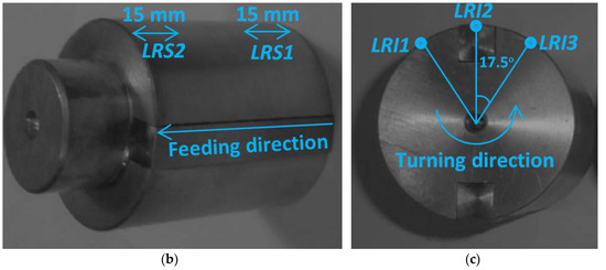All roughness measurements were taken with a Mitutoyo Surftest SJ 401 roughness tester (Mitutoyo America Corporation, Aurora, IL, USA) (Figure 6a). As noted above, the measurement locations along the specimen and regarding the inserts were taken as influential factors. These factors are the LRS and LRI. For the LRS, two values were taken: LRS1, roughness at the beginning of the specimen, and LRS2, roughness at the end of the specimen along the feeding direction. Specifically, LRS1 was taken within the first 15 mm of the specimen and LRS2 was taken within the last 15 mm of the specimen (Figure 6b). For the LRI, three levels were established according to the turning direction: LRI1, roughness before the insert, LRI2, roughness on the insert, and LRI3, roughness after the insert. LRI2 was established along the generatrix located at the center of the insert, and LRI1 and LRI3 were established along two generatrix separated by 17.5° and −17.5° from the first one, respectively (Figure 6c).