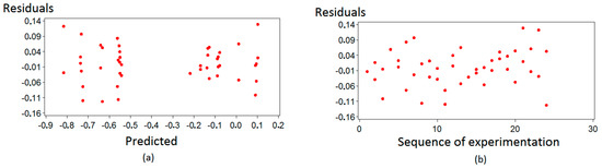 When the hypotheses on the residuals of the model were checked on the response variable Ra, there was evidence of a lack of normality and a lack of heterocedasticity. Due to this fact, carrying out a transformation of the roughness data was necessary. Logarithmic transformation of the response variable is simple and preserves the order of the original roughness data. Thus, a Naperian logarithmic transformation was applied on the Ra data and an ANOVA analysis was conducted, finding no evidence in this new variable a lack of either normality or heteroscedasticity, or the existence of any pattern in the model. The checking of these hypotheses can be observed in Table 7 and in Figure 7, respectively.