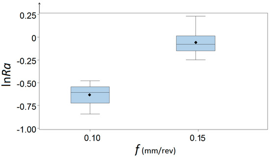 Box and whisker plot with dispersion of lnRa with respect to the feed rate factor.