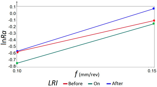 The interaction between the feed rate and the location with respect to the insert, f*LRI, is graphically illustrated in Figure 10. For the feed rate of 0.10 mm/rev, there are no differences between the logarithm of the roughness before and after the insert, while they do exist when the feed rate increases, worsening the roughness after the insert in a larger proportion. However, when the feed rate is 0.15 mm/rev, there are no differences between the surface roughness before the insert and on the insert. Figure 11 shows the usefulness of interaction graphs. Since the three lines represented are not parallel, the model underlying the ANOVA analysis is not additive. Graphically, the moderating effect of LRI1 on the increase of the Ra roughness can be seen when the feed rate f augments it.