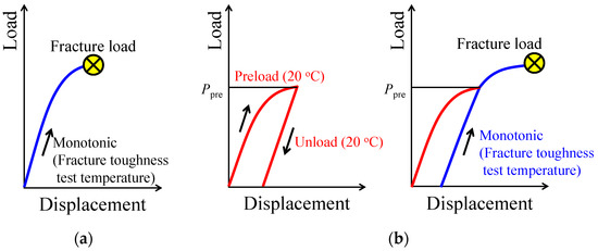Loading pattern for fracture toughness tests without and with compressive residual stress (CRS): (a) case without CRS and (b) case with CRS. In case (b), the first figure represents the case in which CRS is applied by preloading the specimen to Ppre at 20 °C, and the second figure represents the case in which the specimen is loaded to fracture at the same temperature as that in case (a).