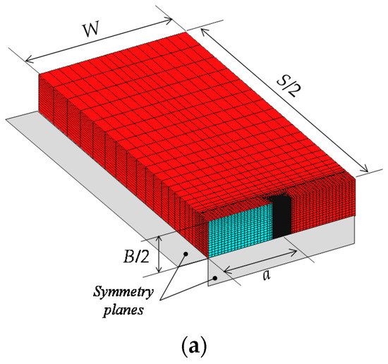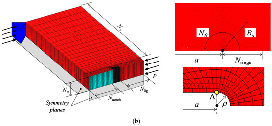 Assuming that the model was symmetric, only one-fourth of the actual test specimen was modeled. The thickness of half of the test specimen was divided into 18 (Na) spaces. The crack tube radius Rs was selected as 2.56 mm to obtain detailed information about the stress distribution for a region at least 10 times the crack-tip opening displacement (CTOD, δt). An initial blunted notch of radius ρ inserted at the crack tip was determined to satisfy δt/ρ > 10 [48] at the load level near fracture, and this radius was different for the cases without and with CRS, as shown in Table 1. The CTOD was measured at node A, as shown in Figure 3b, which was the point at which the straight flank in the undeformed mesh met the curved notch surface [48]. This tube was divided into 24 (Nθ) equal spaces in the circumferential direction and 50 (Nrings) unequal spaces in the radial direction. For all the cases, 20-node isoparametric three-dimensional solid elements with reduced (2 × 2 × 2) Gauss integration points were employed. The total number of nodes was 156,194, and the total number of elements was 35,838. The analysis was performed using the solver WARP3D [49].