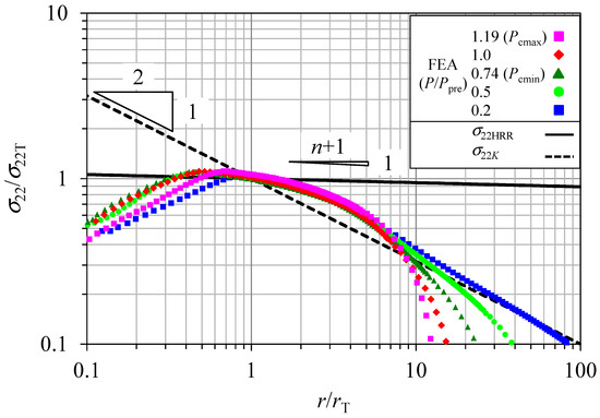 Figure 5 indicates that the EP-FEA σ22 distribution without CRS was fairly scaled from a low load up to the maximum experimental fracture load by using the aforementioned T-scaling method. The stress distribution was in the steady state and in the so-called SSY stress state.