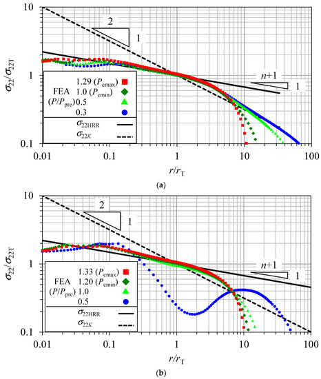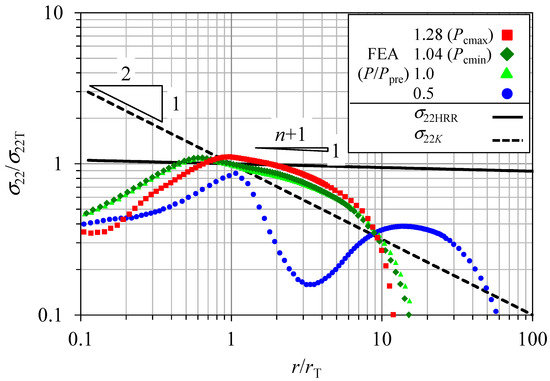 In contrast, the EP-FEA σ22 distribution with CRS in the reloading procedure was considerably different, as shown in Figure 6. In this figure, the cases for P/Ppre = 0.5, 1, 1.04, and 1.28 are plotted. Here, 1.04 and 1.28 represent the minimum and maximum fracture loads, respectively, observed in the experiments divided by Ppre. The figure indicates that the stress level at a low load was very low compared to the levels in the theoretical K or HRR stress distribution, because of the initially provided CRS. However, it is interesting to note that the σ22 distribution was enveloped by the theoretical K and HRR stress distributions when the load was close to P/Ppre = 1.04, which was the minimum fracture load observed in the experiments. This finding suggested that even for the case with CRS, the specimen midplane EP-FEA σ22 distribution at fracture in the DBTT region was enveloped by the theoretical K and HRR stress distributions and was under the SSY condition. This led to the proposal of monitoring σ22 at the T-point for fracture prediction with CRS.