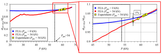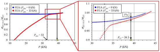 Next, the fracture load for the case with CRS was predicted by applying the T-scaling method. Fracture is expected to occur when the specimen midplane crack-opening stress σ22 on the x1-axis at the T-point (x1 = rT in Equation (1)) reaches the material-dependent but load-independent stress σ22T given by Equation (2). Because the theoretical σ22T did not coincide with EP-FEA σ22T, the fracture load for the case with CRS was determined as the load when EP-FEA σ22 at the T-point for the cases with CRS reached 99% of that for the case without CRS, as practically shown in Figure 7.
