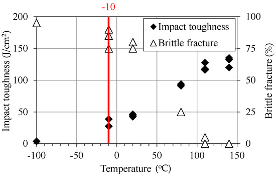 Charpy test results for S45C. The reference temperature of −10 °C was selected for performing fracture toughness tests in the ductile-to-brittle transition temperature (DBTT) region.