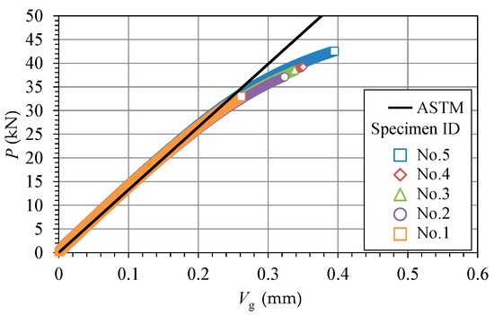 Figure 10 shows the diagram of load P versus the crack-mouth opening displacement (CMOD) Vg for the five tests. The slope of the linear part of the P–Vg diagram showed good coincidence with that obtained from the following equation, which is given in ASTM E1820 [51]. In addition, the paths of the five tests showed good reproducibility.
