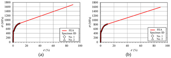 True stress–true strain curves for S45C used in elastic-plastic finite element analysis (EP-FEA) compared with the two tensile test results. (a) −10 °C, (b) 20 °C.