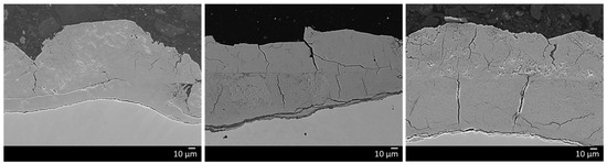 Figure 3. Scanning electron microscopy (SEM) images of the cross-sections of the low Mo (A) material (left), low Mo (B) material (middle), and high Mo material (right).