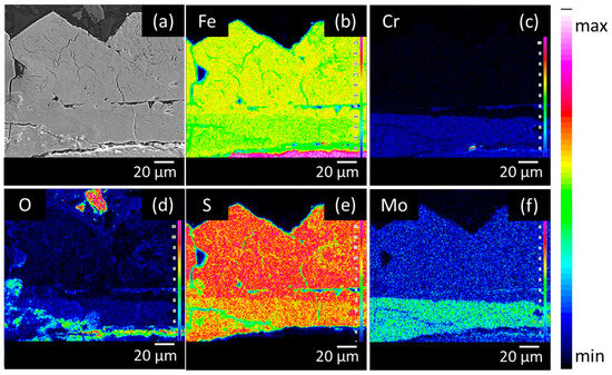Figure 6. Cross-sectional BSE image (a) and elemental mappings of (b) Fe, (c) Cr, (d) O, (e) S and (f) Mo of the high Mo material after 28 days of immersion in the H2S saturated test solution.