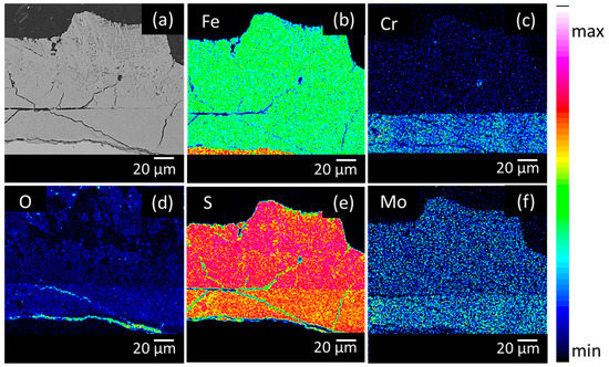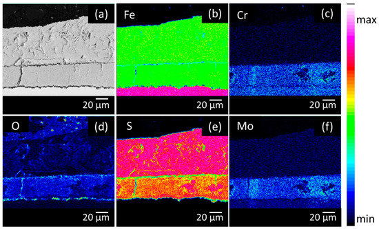 Chromium was only present in the inner layer of the corrosion products and in the base material. Cr will react selectively with O [14,29], the increased amount of O (cf. Figure 4, Figure 5 and Figure 6) in the inner layer confirmed this assumption. Figure 7 again supported these results. Figure 7A shows the formation of MoS2 near the surface. Figure 7C shows that closer to the surface, in the presence of a higher concentration of Fe, Cr2FeO4 will be formed. On the EPMA images (cf. Figure 4, Figure 5 and Figure 6) a highly elevated concentration of O is visible in a thin layer above the metal surface. This could be a Cr2FeO4 layer that was formed. The formation of an oxide layer in between the mackinawite and the base metal was also observed by Genchev et al. [11]. This oxide layer could cause a deterioration of the adhesion of the corrosion products to the surface, and as such, have an influence on the hydrogen uptake and the corrosion rate [30].