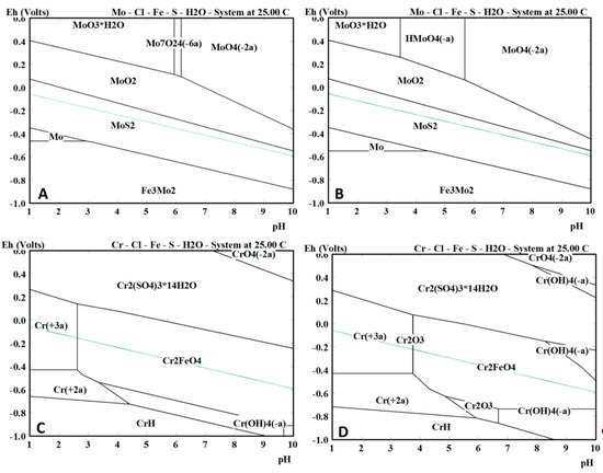 Figure 7. The equilibrium phase diagram obtained using HSC Chemistry for the Mo and Cr specimens near the surface (A,C, respectively) and further away from the surface (B,D, respectively). During the test a pH value between 2.8 and 4.0 was maintained.