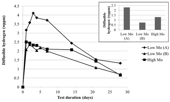 Figure 8. Amount of diffusible hydrogen, determined using a hot extraction technique, present in the low Mo (A), the low Mo (B), and the high Mo material as a function of the test duration and after electrochemical charging (inset).
