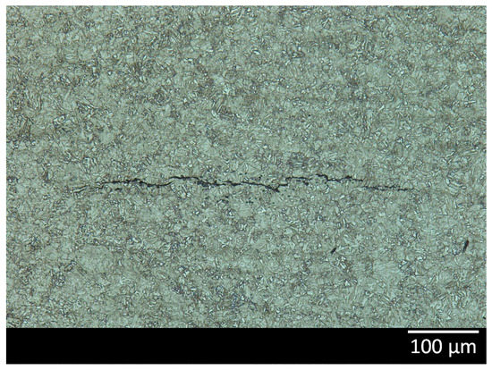 After the initial peak, the amount of diffusible hydrogen was decreasing rapidly for all of the materials. This decline could have several origins. On the one hand, cracks could be generated in the materials through Hydrogen Induced Cracking (HIC), rendering the formation of H2 in the cracks and a reduction in the amount of diffusible hydrogen. Therefore, all materials were investigated by cross-sectional analysis in order to detect the presence of cracks. Only in the low Mo (A) material that was in the test solution of 28 days, a crack was observed, as can be seen in Figure 9. However, since this HIC crack only occurred at the end of the testing period, it not likely to be the cause of the decline of the amount of diffusible hydrogen, since this already started after 1 to 3 days of testing. On the other hand, the decline of diffusible hydrogen could also be caused by a diminishing generation of hydrogen. Hence, the corrosion rate as a function of test duration was investigated.