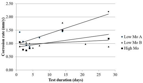 Figure 10. The corrosion rate of the low Mo (A), the low Mo (B), and the high Mo materials as a function of the test duration.