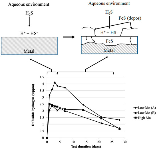 A general schematic overview of the corrosion product generation and its influence on the diffusible hydrogen content is shown in Figure 11. The first generation of FeS corrosion product caused a first steep increase of the amount of diffusible hydrogen in the steel. After a few days, a double layer of FeS corrosion products was formed. The outer layer was generated via a deposition mechanism and was very often missing, indicating its poor adhesion. The inner layer could be formed by the diffusion of Fe from the metal through the FeS layer or by the diffusion of the S containing species through the FeS layer to the metal. The latter is assumed to occur, since the original flat surface of the sample was still clearly visible in the corrosion products, as can be observed in Figure 3. In addition, the FeS layer growth could be induced by H2S solid state diffusion through the crystalline layer or by ionic conduction of S2− and HS. Both of the situations would imply a decrease in the amount of diffusible hydrogen, as was experimentally observed. On the one hand, the H2S solid state diffusion could create a decrease in the diffusible hydrogen content that is caused by a decrease in the corrosion rate. On the other hand, during the ionic conduction of S2− and HS, a lot of hydrogen is already released outside the FeS layer and will be lost in the environment as H2. Since the corrosion rate does not clearly decrease as a function of time, as can be seen in Figure 10, the ionic conduction of S2− and HS is believed to be the mechanism of FeS formation during these tests. These results are in agreement with the results of Huang et al. [19]. Using hydrogen permeation, they observed a decrease in the steady-state hydrogen permeation current and the hydrogen diffusivity. This was attributed to the corrosion product film being an n-type semiconductor with an anion selectivity. As such, S2− and HS ions are attracted to and H+ ions are repealed from surface.