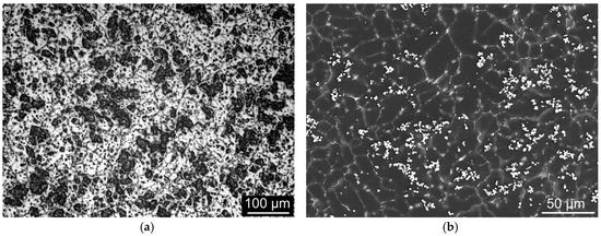 Samples annealed at 560 °C exhibited a decrease in the presence and size of precipitates; Dy was dissolved in the solid solution in the greatest extent. The volume of precipitates in the 560 °C/8-h sample was slightly higher than in the 560 °C/16-h sample (5.8% compared to 5%); however, the 16 h’ sample exhibited re-precipitation of the continuous β-phase, which was neglected during these analyses. The average precipitate size in both the samples was approximately 1 µm, which was the smallest of all the investigated states. This was caused by the annealing temperature, which provided all the alloying elements with favourable solubility, as well as simplified diffusion. These phenomena finally contributed to the formation of very fine precipitates during subsequent quenching.