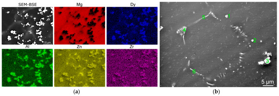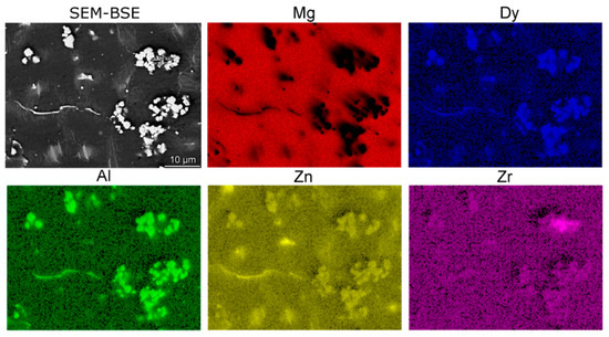 The distribution maps of the individual elements acquired using SEM-EDX chemical composition mapping within a selected area of the 520 °C/8-h sample are shown in Figure 3. The analysis showed the major portion of Mg to be present in the matrix, whereas the other elements were primarily present in the secondary phases. The overall content of Zr was very low. Therefore, the mapping was not able to accurately determine its distribution.