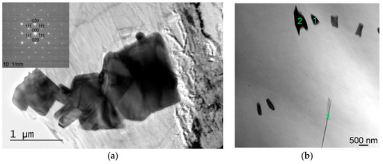 The structures annealed at 560 °C featured quite a significant presence of very fine polygon-shaped precipitates and thin elongated precipitates, identified as Mg24Dy5—more precisely Mg24(DyZn)5—phase (containing ~60 wt. % of Dy) and LPSO phases, respectively. Based on the works published by others [20,37], the maximum solubility of Dy in Mg is about 25 wt. % at 561 °C and decreases with decreasing temperature. Therefore, rapid cooling (quenching) from 560 °C resulted in preserving the highest amount of Dy in the matrix of all the investigated annealed samples (approx. 4.5 wt. %). However, the majority of this element was again found in the secondary phases. The 560 °C/16-h sample exhibited significant re-precipitation of the β-phase in the form of coarse plate-like structures (not observed after 8 h annealing), as well as the presence of Dy-rich precipitates and LPSO phases, differing in their morphology although having similar chemical composition—e.g., the morphology of the particles depicted in locations 2 and 3 in Figure 9a pointed to their different nature. The more or less equiaxed-shape precipitate 2 had a cubic lattice corresponding to (Mg,Zn)x Dy phase [45]. On the other hand, the morphology and composition of the thin elongated precipitate 3 revealed the precipitate to be one of the hexagonal LPSO phases of the 18R type. These phases have been reported to significantly increase mechanical properties by creating obstacles for non-basal slip deformation mechanisms [49].