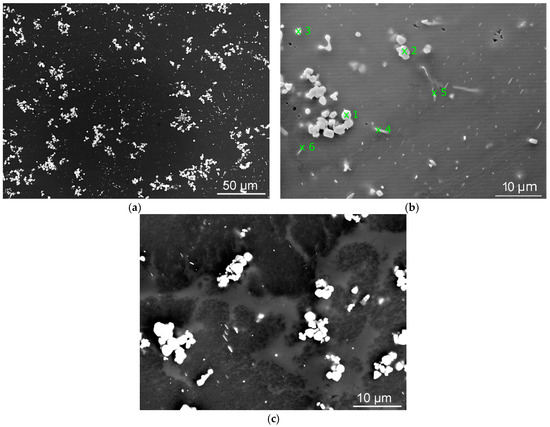 SEM-BSE scans of heat treated samples: (a) 560 °C/8-h sample; (b) analysed locations in the 560 °C/8-h sample; (c) detailed image of the secondary phases in the 560 °C/16-h sample.