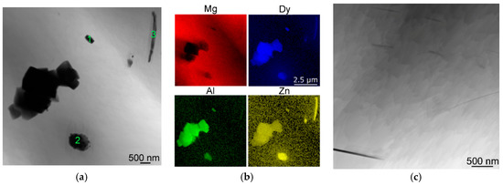 Figure 9a depicts the TEM image of the 560 °C/16-h sample in which three different precipitates were examined. The precipitate in location 1 contained 27 wt. % Mg plus 67 wt. % Dy, 2 wt. % Al and 0.3 wt. % Zn; the precipitate in location 2 consisted of 66.4 wt. % Mg, 24.6 wt. % Dy and 9.0 wt. % Zn; and the precipitate in location 3 contained 60.9 wt. % Mg, 26.8 wt. % Dy and 12.3 wt. % Zn. The distribution maps of the individual elements are shown in Figure 9b. Figure 9c shows the detail of the fine elongated particles (such as particle 3 in Figure 9a) characterised as the 18R-type LPSO phases.