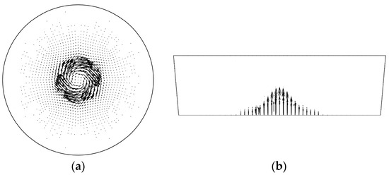 The distribution of EMF on bottom surface (Z = 0 m) and vertical section (Y = 0 m) of the ladle are shown in Figure 2a,b, respectively. Figure 2a shows a clockwise spin of the EMF distribution on the bottom surface, which may drive molten steel in the vicinity of the ladle bottom to rotate and further drive the bulk to rotate due to the shear force. Figure 2b shows at the Y = 0 m section, there is evidence of upward-pointing parabolic EMF distribution, more concentrated in the middle and less on either end of the vertex. The resultant force has an upward and rotational direction and, therefore, may drive molten steel in an upward and rotational motion.