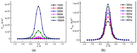 Distribution of the EMF magnitude for different current intensities with a fixed frequency of 50 Hz (a), and different frequencies with a fixed current intensity of 1200 A (b) along the radial direction.