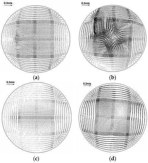 Distribution of the flow field at 360 s ((a,b) are non-EMS and bottom-rotating EMS at I = 300 A on Z = 0.1 m section, respectively; (c,d) are non-EMS and bottom-rotating EMS at I = 300 A on Z = 2 m section, respectively).