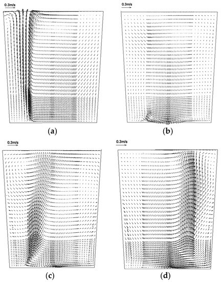 Figure 5a shows the flow pattern on Y = 0 m section without EMS. As depicted, the region with high velocity settles over the argon inlet. The fluid flows upward to the top surface and forms a circulatory flow. This could be attributed to the fact that argon gas bubbles would float upward and escape from the top surface after being jetted from the inlet. As a result, the fluid is driven to flow upward and a circulatory flow is formed due to the interaction force between bubbles and molten steel. Figure 5b–d respectively show the flow pattern with bottom-rotating EMS on Y = 0 m section, Y = 0.5 m and X = −0.4 m section. Figure 5b shows that the flow direction of molten steel is downward near the neighborhood of the agitator, this is because the centrifugal effect caused by the rotating flow of fluid forms a lower pressure region, and resultantly, the fluid in the high pressure region moves along the pressure gradient and down toward the low pressure region. After the bottom-rotating EMS has been applied, the notable upward flow disappears on the Y = 0 m section, but the upward flow is manifested on the section of Y = 0.5 m and X = −0.4 m. It follows that the flow pattern is deflected under the effect of bottom-rotating EMS. The phenomena implies the combined method is beneficial to improve the distal flow and reduce the dead zone inside the ladle.
