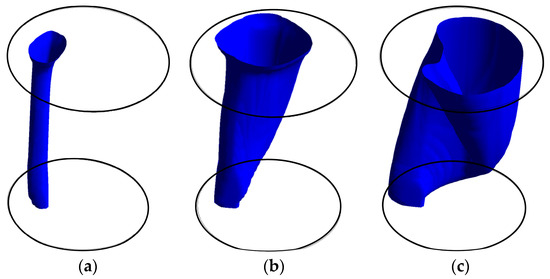 Figure 6 shows the isosurface of VAr = 1.0 × 10−4 (volume fraction of argon) for non-EMS and bottom-rotating EMS with the current I = 600 A and I = 1200 A at 360 s. The whole shape of isosurface remains columnar when absent of EMS. It implies the impingement effect caused by the argon bubbles floating upward and passing through the slag layer is intense, which makes it easier to form open-eye and causes re-oxidation and slag entrapment near the slag layer. It is evident from Figure 6b,c, with the employment of the bottom-rotating EMS, the isosurface occurs significant deviation and the isosurface further extends and deflects when the current reaches 1200 A. The gas-liquid two phase region is extended with increasing current intensity, which is beneficial to remove inclusions and reduce the impingement of argon bubbles on the free surface.