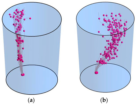 Bubble trajectory at 420 s for (a) non-EMS and (b) bottom-rotating EMS at I = 600 A.