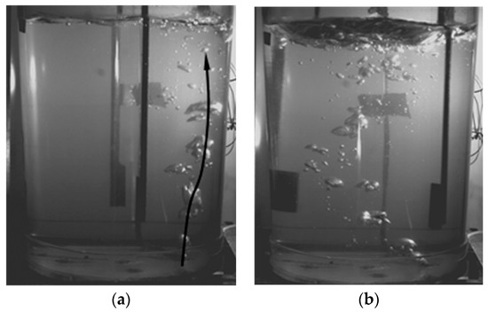 Figure 7 shows the trajectory of argon gas bubbles at 420 s. When the bottom-rotating EMS is not applied, the bubbles float upward under the action of buoyancy after the ejection from the porous plug. Its trajectory is linear with little deflection. When the bottom-rotating EMS is applied, the molten steel near the bottom of ladle is driven by the rotating EMF and further promotes rotational motion. Due to the effect of the interaction between the gas and molten steel, the trajectory of bubbles gets deflected along with the tangent direction of the flow and, as a result, the distribution of bubbles become more dispersed. This phenomenon is useful in prolonging the residence time of argon gas bubbles and reducing the impact of bubbles on the slag layer. The water model experiment verifies the identical phenomenon according to Figure 8.