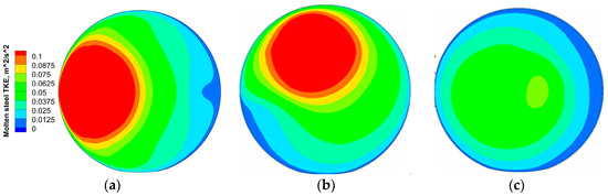 Figure 12 shows the distribution of temperature near the middle of the ladle (Z = 2 m section) with a different current intensity. It is clear that there is a clear temperature gradient with higher temperature in the center of ladle and lower temperature near the ladle wall when the current intensity is 300 A. However, in Figure 12a–c, the highest temperature region expands with the current intensity due to the heating effect and improved flow. The distribution of temperature tends to be uniform and the value of the temperature reaches 1862.25 K as the current intensity reaches 1200 A. Therefore, increasing the current intensity is beneficial for compensating the heat loss and eliminating the temperature stratification of molten steel in a ladle.