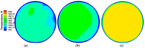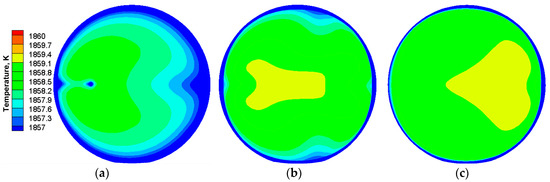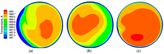 The analysis of temperature field is based on the results of transient simulation at 360 s. The distribution of temperature for non-EMS and bottom-rotating EMS on Z = 0.3 m, Z = 2.0 m, and Z = 3.7 m sections are shown in Figure 10 and Figure 11, respectively. As shown in Figure 10a,b, a wide region with a lower temperature close to the ladle wall and the porous plug is found. The case without EMS indicates a distinct temperature stratification. The two reasons for this phenomenon, one is the heat transfer around ladle wall and the heat absorption of lower temperature argon gas, and another is that the stirring intensity of argon into molten steel is insufficient. After applying the bottom-rotating EMS, the lower temperature region is decreased and the temperature stratification is clearly improved as shown from Figure 11a,b. This is mainly because the thermal effect of the alternating magnetic field partly compensates the heat loss of molten steel and the combination of AGS and the bottom-rotating EMS improves the flow field of molten steel. With the flow field fully mixed, the top surface approaches a uniform temperature distribution according to Figure 10c and Figure 11c. Due to the thermal compensation, the temperature for using the bottom-rotating EMS is slightly higher than that for non-EMS.