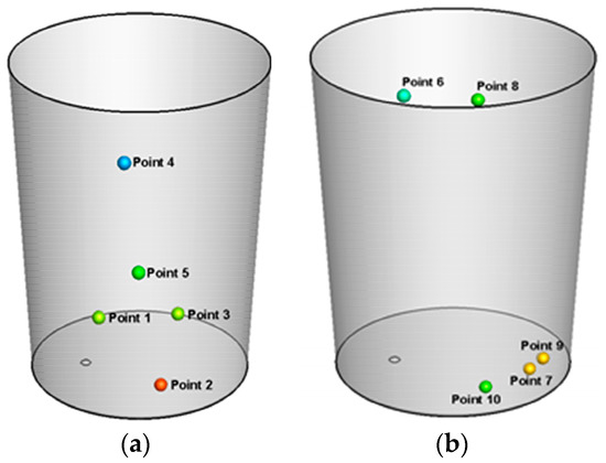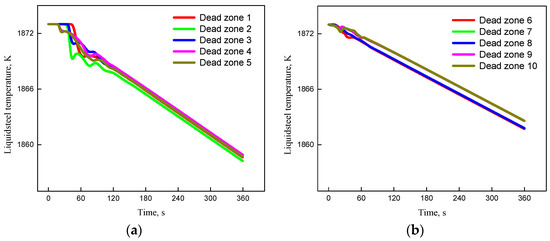 In order to investigate the temperature change in the dead zone, points within different dead zones were monitored and their temperature change with time was analyzed. The distribution and location of the points are shown in Figure 13 and Table 3. The results are shown in Figure 14a,b, where Figure 14a shows the case of non-EMS and Figure 14b shows the case of a combined method with current of 1200 A. As shown in Figure 14a, the temperature at each point of the dead zones decreases steadily and the average temperature drops from 1873 K to 1858.7 K in six minutes. The average temperature drop is about 2.38 K/min. After applying bottom-rotating EMS, the average temperature of each point declines from 1873 K to 1862.9 K and the average temperature drop is about 1.68 K/min according to Figure 14b. Therefore, the increasing current intensity is favorable for keeping the temperature of molten steel steady.