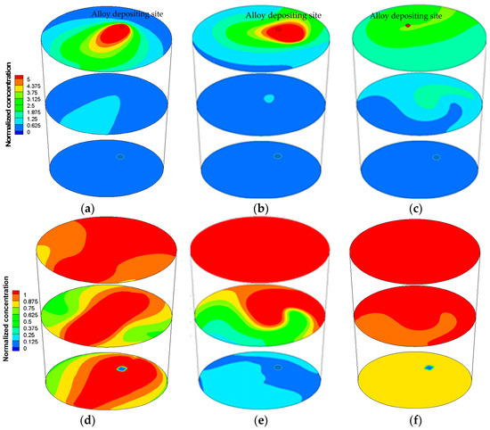 Contours of the alloy normalized concentration at 40 s and 100 s ((a–c) are the non-EMS with alloy depositing site situating point (−1.3, 0, 3.732), bottom-rotating EMS at I = 600 A with alloy depositing site situating point (−1.3, 0, 3.732), and bottom-rotating EMS at I = 600 A with alloy depositing site situating point (−0.38, 0.58, 3.732) at t = 40 s, respectively; (d–f) are the same cases at t = 100 s).