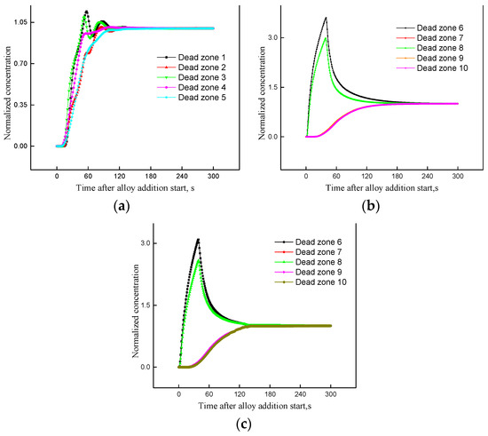 Figure 16a–c illustrates the distribution of normalization concentration along time at different dead zone points. Figure 16a is the case of the single argon gas stirring with the alloy depositing site situating point (−1.3, 0, 3.732). It is shown that the change of each point is the same. When the alloy is added, the normalization concentration increases linearly in the former 50 s, and reaches 1 at 160 s, which indicates the alloy becomes fully mixed in the ladle. Figure 16b,c are the cases with the combined method. For the former, the alloy depositing site is at point (−1.3, 0, 3.732), and for the latter, the depositing site is at the point (−0.38, 0.58, 3.732). The curves of test points 6 and 8 show a tendency to increase and then decrease due to the location of the test point in the upper part of ladle. The curves of test point 7, 9, and 10 are almost coincident, which implies there is the same flow on this test point. The time of full mixture is about 230 s for case 2 and 140 s for case 3 as shown from Figure 16b,c. The full mixing time is shortened from 230 s to 140 s when the depositing alloy site situates the point (−0.38, 0.58, 3.732). Comparing case 1 and case 3, the mixing time of combined method is less than that with the single argon gas stirring method. Therefore, the combined method is beneficial to accelerate the dispersion of additive agent and improve the quality of products in the industry process.