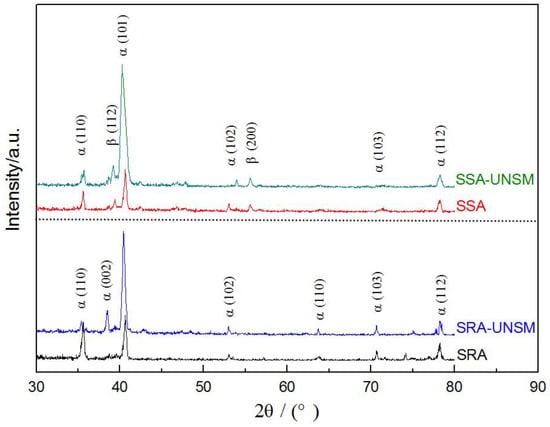 The XRD patterns of these four groups of TC4 specimens are compared in Figure 3. It can be seen that the β-phase transition actually occurs with the solid solution aging heat treatment. By means of UNSM, the intensity of characteristic peak α (101) is strengthened. The ultrasonic surface impact does not induce the phase change, as it is observed in stainless steel [23]. Taking the full width at half maximum (FWHM), the average grain size of the SPD layer can be calculated by the equation given by Scherrer and Wilson [24]. It is less than 100 nm.