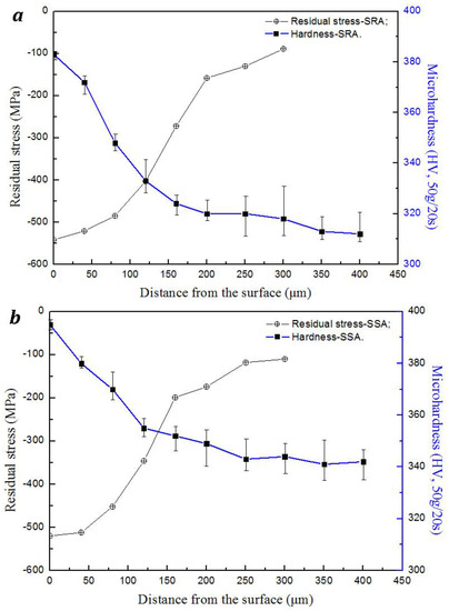 The micro-Vickers hardness and surface residual stress along the depth were measured, as depicted in Figure 4. The microhardness of the SRA TC4 specimen is about 310 HV, and it is about 340 HV to SSA. The values of SRA-UNSM and SSA-UNSM are 380 HV (approximately 22% improved), and 395 HV (about 16% improved), respectively. The microhardness of the specimen with UNSM rapidly decreases from the surface to the depth of 120 μm, and then decreases more gradually. The Hall–Petch theory illustrates that the hardness and the yield stress relate to the grain size [25]. This is also discussed in the other reports [26]. When the dislocation multiplication rate is balanced, the increase in strain will not reduce the subgrain size any further. For example, Suh et al. reported that the maximum surface hardness wasn’t improved even the parameters of UNSM are increased higher [27].