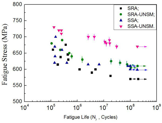 The fatigue characteristics of TC4 subjected to UNSM are shown in Figure 6. Specimens that did not encounter failure are shown as run-outs. Fish-eye-type cracks are marked with short vertical bars. Inner cracks are observed on the specimens with UNSM, while the fatigue lives are more than 106 cycles. In contrast, all of the un-UNSMed specimens show the surface cracks, no matter the fatigue life. From the S–N curves, it is evident that UNSM improves the 108 cycles fatigue strength of TC4. The fatigue strength of SRA-UNSM is increased by 7.0%, while that of SSA-UNSM is increased by 11.7%.