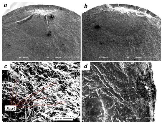 where σa is the nominal stress amplitude at the surface, σat is the stress amplitude at the compress deformed α-phase, d is the diameter of the specimen, h is the depth of the compress deformed α-phase, and area is the area of each part. The results are plotted in Figure 10. It is seen that the stress intensity factor calculated from the facet area ΔKfacet was in the range of 8.3–10.0 MPa·m1/2. The plastic zone size rP at the crack tip under plain strain conditions can be calculated by Equation (3) for a model-I crack [36],