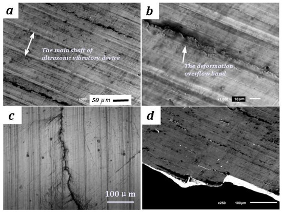 Figure 8 is the observation of the surface crack propogation. On the surface of UNSMed TC4 after axial symmetric tension-compression fatigue, there are some deformation overflow bands that are parallel to the process traces. The distance between the bands is about 260 μm. However, the deformation overflow bands cannot be distinguished in optical micrographs. They might be induced more clearly because of the crack slip during the fatigue test. The surface cracks preferentially extend along them, and microcracks easily split in the local zone. The steps of crack propagation are observed, because cracks change lanes to the process traces sometimes through the discontinuous longitudinal microcracks. They were also investigated by Suh [27]. This means that the energy field of crack evolution depends on both the deformed crystal slip and the surface remodeling.