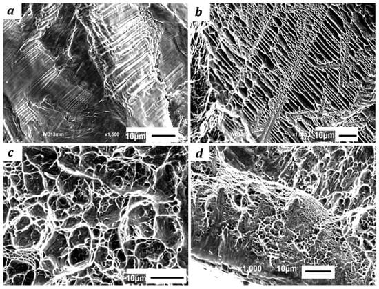 Observation of the fracture surface: (a) Sliding lines on a white band; (b) Quasi-cleavage plane; (c) Equal-axis ductile dimples of un-UNSMed specimen; (d) Parabolic fossae and oval toughening nests of SSA-UNSM beneath the surface.