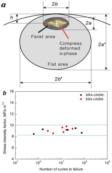 The fish eye-type fracture surface is divided into three areas: inclusion area, facet area, and flat area. A first area is the inclusion in the center of a fish eye, which changes to a compress deformed α-phase to TC4 with UNSM instead. The second is the facet area with a rough surface, as shown in Figure 7c. The third area is the area with flat surface located around this facet area. The flat area is seen as a dark grey ellipse. The stress intensity factor, ΔK, which is relevant to these three different regions described above, can be calculated by Equations (1) and (2) [34,35,36],