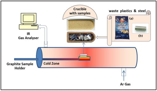 Plastics are a group of synthetic materials consisting of carbon as a sole or major element [5]. Their rapidly-growing consumption in modern society has inevitably given rise to a large quantity of corresponding waste accumulation [6]. Over the past few decades, the urgency to recover resources from waste plastics has gained unprecedented attention around the world [7,8,9]. However, the technique concerning the reuse of complex snack packaging plastic waste is still not feasible due to its heterogeneous composite constitution and unavoidable external contamination [10,11,12]. Heating plastic waste together with a steel sample at elevated carburization temperatures under an oxygen-free environment could subject plastic waste to pyrolytic gasification and decompose into small molecular hydrocarbon gases [13]. The small molecular hydrocarbon gases, like methane, could, in turn, work as valuable carbon resources for steel carburization. This sustainable carburization practice would not only alleviate the consumption of natural gas used in the conventional gas carburization of steel, but can also reduce the accumulation of plastics waste.
